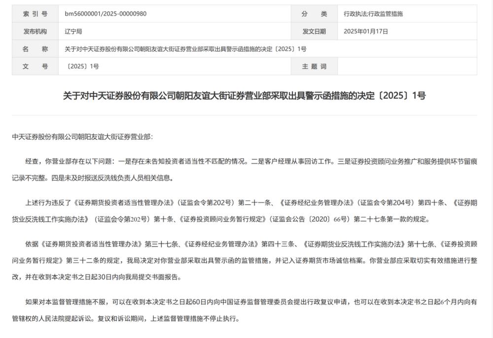 辽宁证监局披露的罚单显示,中天证券朝阳友谊大街证券营业部存在以下问题:一是存在未告知投资者适当性不匹配的情况。二是客户经理从事回访工作。三是证券投资顾问业务推广和服务提供环节留痕记录不完整。四是未及时报送反洗钱负责人员相关信息。