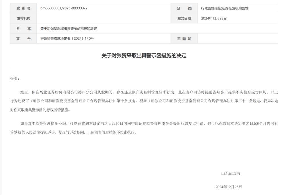 1月16日,山东证监局披露的罚单显示,张贺在兴业证券德州分公司从业期间,存在违反账户实名制管理要求行为,且在客户回访时提前告知客户提供不实信息应对回访。山东证监局决定对张贺采取出具警示函的行政监管措施。记者注意到,目前中证协官网已无张贺在兴业证券的相关从业信息。