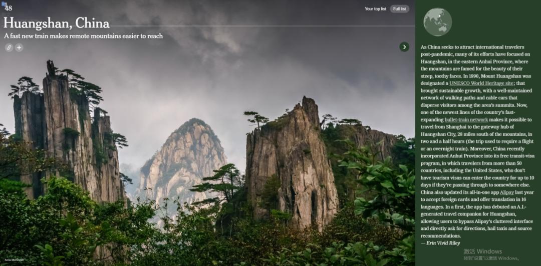 黄山被《纽约时报》评为2025年全球最值得去的52个地方之一《纽约时报》指出,位于安徽省东部的黄山以陡峭山脉、怪石嶙峋闻名。中国在过去30年急速发展,黄山的旅游步道和缆车网络都有良好维护。加之中国高铁日趋完善,从上海到黄山市仅需2.5小时车程。此外,中国在免签证政策和Alipay(支付宝)的普及化,让海外友人能更方便地游览各景点。
