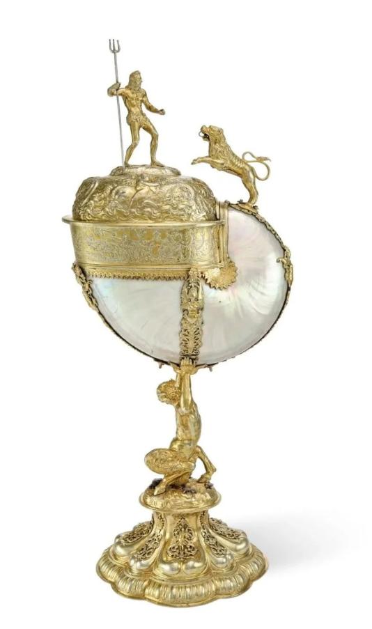 一件德国镀银鹦鹉螺杯近日上拍,最高估价达1,000,000美元。该杯底座为独特椭圆形,饰有阿拉伯式卷草纹图案,中央为古典人物雕塑。茎部塑造萨提尔形象,跪于土丘上,土丘点缀小动物。鹦鹉螺壳被四条镂空带环绕,带上铸有带翼女性。口沿蚀刻海王波塞冬与海怪图案,盖子雕有小爱神骑海怪,顶端为手持三叉戟的海王波塞冬,面对跃出的狮子。可拆卸盖子下,狮子与巨龙搏斗场景跃然眼前。罗斯柴尔德