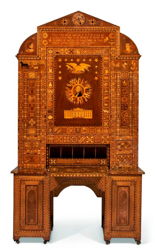 一件署名为URIAH EBERHART(1866-1937)的胡桃木书桌书柜组合上拍,估价最高100,000美元。该作品制于1900年,来自俄亥俄州萨凡纳,背面刻有“由UH EBERHART制造”。此组合镶嵌细工精湛,拼花繁复,共镶嵌135,511块木料,涵盖537种不同木材,始于1896年11月17日,历时近四年,于1900年7月31日完成。加莱