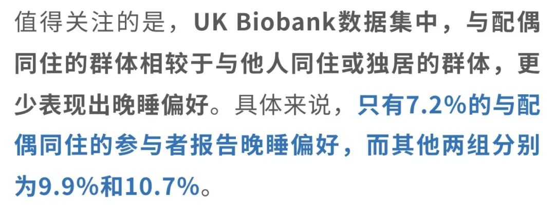 这一差异表明,配偶之间可能由于日常生活作息的相似性,形成了一种共同的生物钟节奏,从而减少了晚睡偏好的出现,表现出更多的同步性。