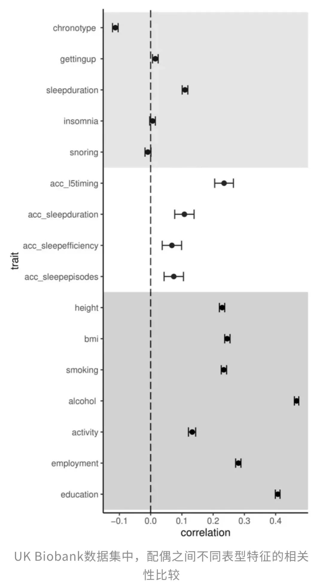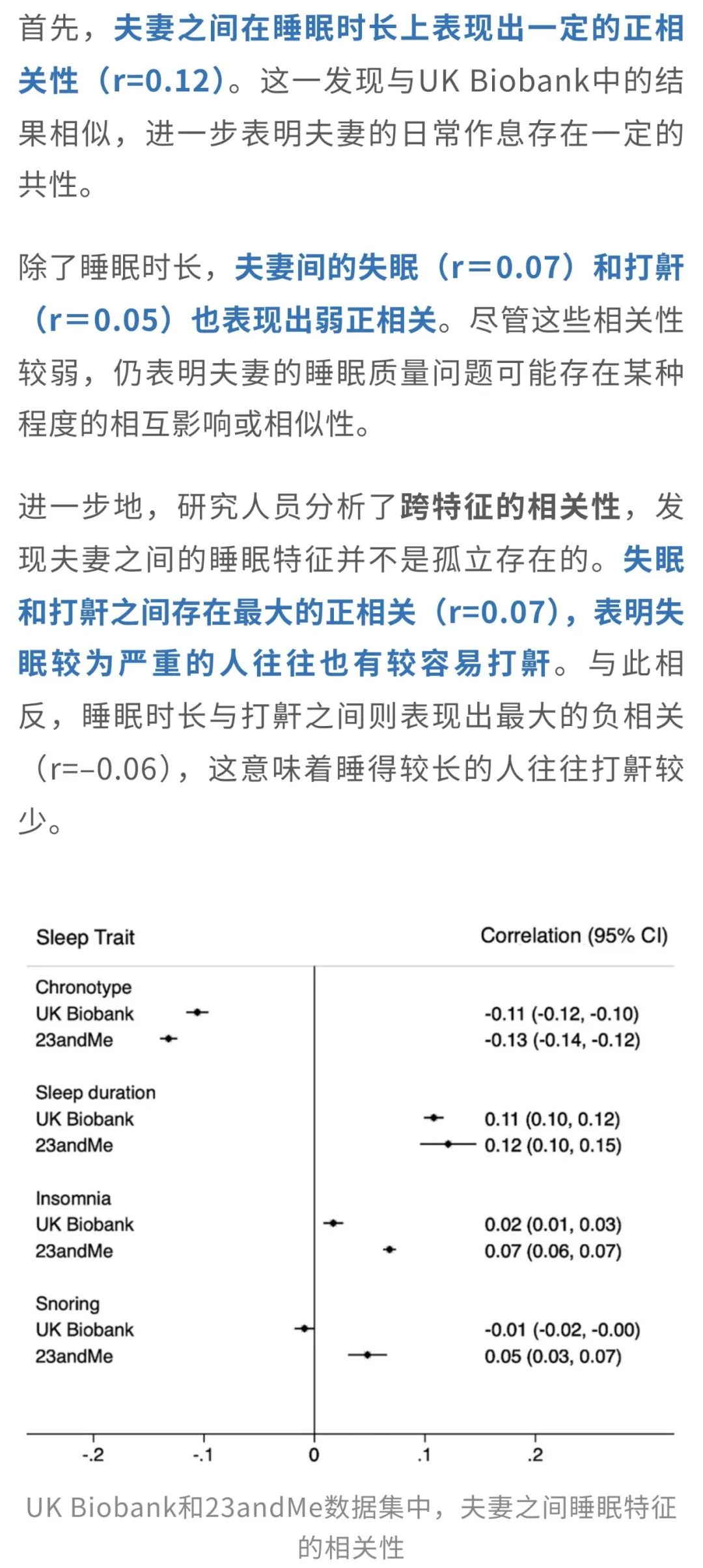 在23andMe数据集中,研究者进一步探索了夫妻之间睡眠特征的相关性,发现:虽然夫妻间的睡眠特征也在整体上呈现一定的同步性。