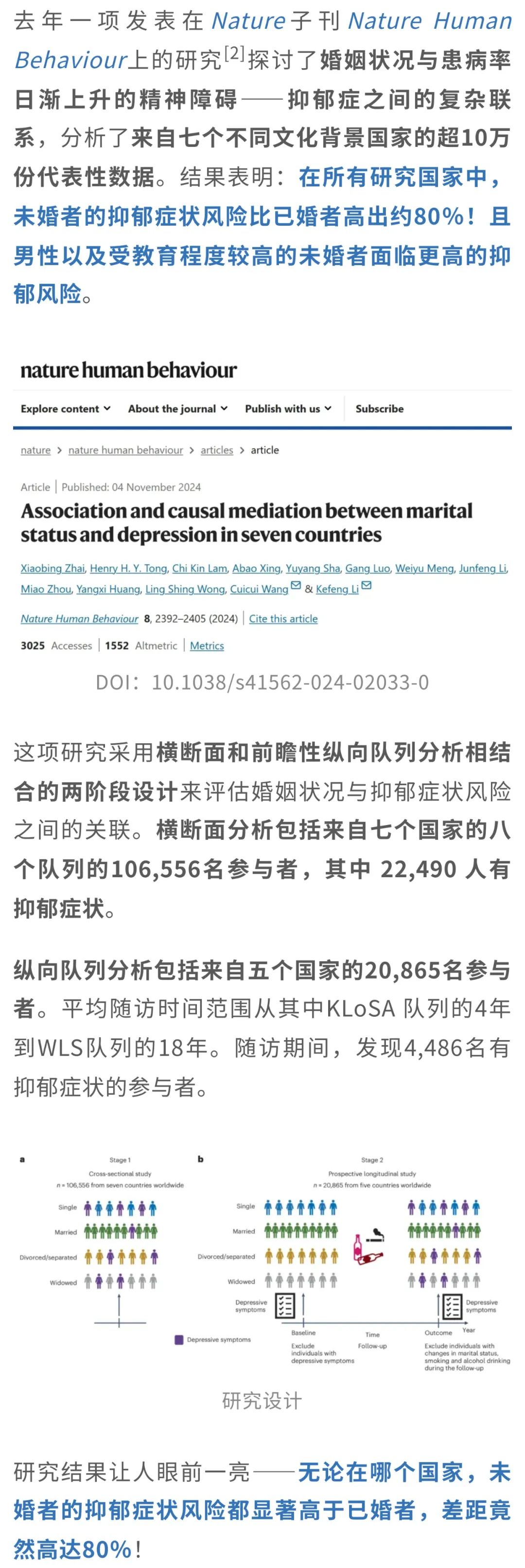 [2] Zhai, X., Tong, H.H.Y., Lam, C.K. et al. Association and causal mediation between marital status and depression in seven countries. Nat Hum Behav 8, 2392–2405 (2024). https://doi.org/10.1038/s41562-024-02033-0