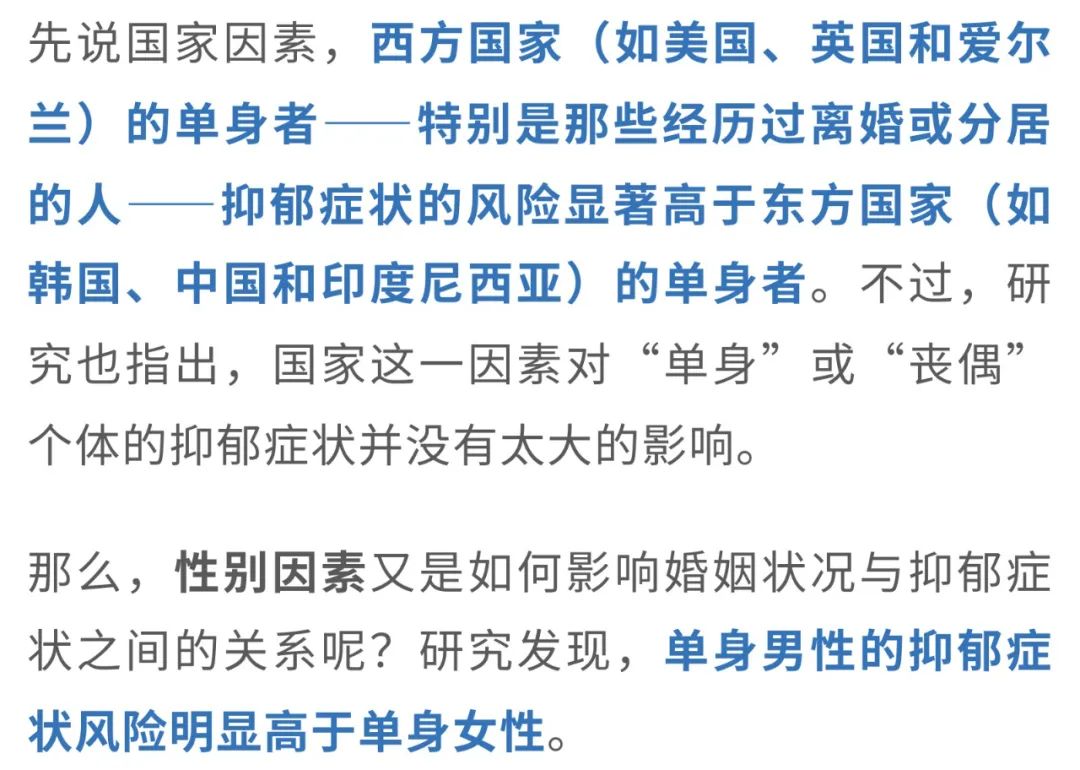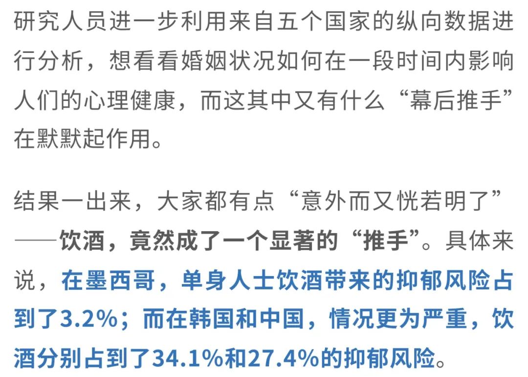 这就像是一颗定时炸弹,单身的人可能在没有婚姻和家庭的支持下,更多地依赖酒精来“排解”压力,结果却不知不觉增加了未来抑郁的风险。另外,饮酒并不是唯一的“幕后推手”,吸烟也是一个潜在的“致郁”因素。总的来说,从这项研究中我们可以看到,单身并不等于心理健康的“免疫墙”。相反,未婚者的抑郁症状风险显著高于已婚者,并且这种关联受到国家、性别和教育程度的显著影响。缺乏婚姻和家庭的情感支持,可能让一些人采取不健康的方式来缓解情绪——例如过度饮酒和吸烟,这些行为最终反而可能加重抑郁的风险。