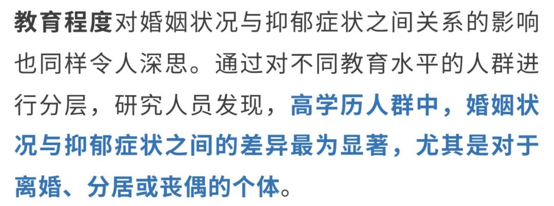 这或许与社会对高学历个体的期待有关——他们可能面临着更多的职业压力、生活节奏更快,情感支持也可能相对较少,从而更容易受到婚姻状况变化的影响。然而,对于单身个体,教育程度似乎并没有起到显著的调节作用。换句话说,无论是高学历还是低学历的单身人士,抑郁症状的风险差距并不明显。