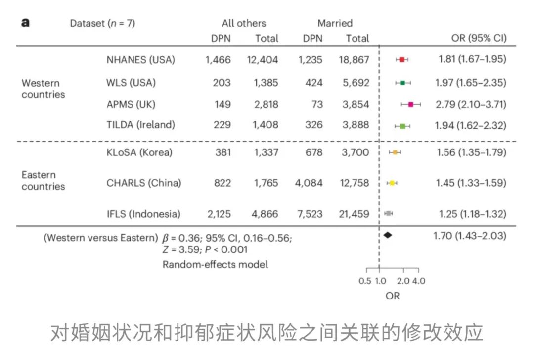 但是,抑郁症状的风险真的仅仅与婚姻状况有关吗?研究者并没有停留在表面,他们接着对一系列变量进行了深入分析,试图揭开婚姻状况与抑郁之间关系的背后原因。最终,他们发现,国家、性别和教育程度这三个因素,似乎在婚姻状况与抑郁症状之间起着调节作用。