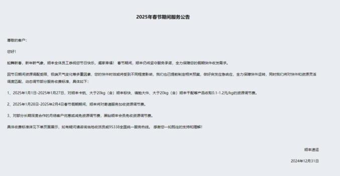 今年春节期间仍将坚守服务承诺,全力保障假期快件收发需求。1月1日—1月27日,对顺丰卡航、大于20kg(含)顺丰标快、填舱大件、大于20kg(含)顺丰干配等产品收取0.1元—1.2元/kg的资源调节费。1月28日—2月4日春节假期期间,顺丰将对寄递服务加收资源调节费。