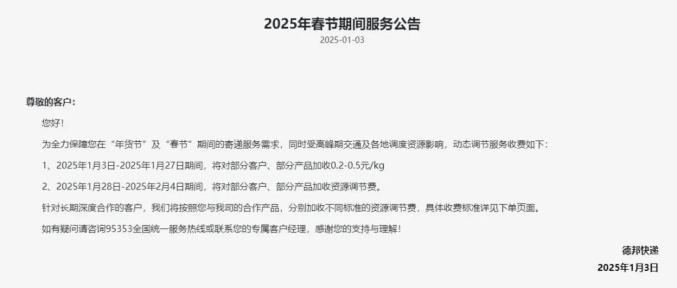 公告显示,为全力保障消费者在“年货节”及“春节”期间的寄递服务需求,将动态调节服务收费。1月3日—1月27日期间,将对部分客户、部分产品加收0.2元—0.5元/kg,1月28日—2月4日期间,将对部分客户、部分产品加收资源调节费。