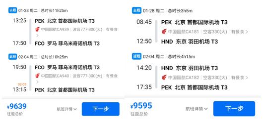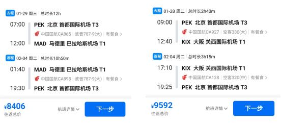1月28-2月4日,国航北京—东京、大阪经济舱机票往返价格最高9595元左右,同期国航北京—罗马机票往返价格9639元,国航北京—马德里机票往返价格仅8406元。