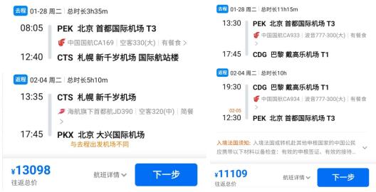 1月28-2月4日,国航北京—札幌经济舱机票往返价格14939元,同期国航北京—巴黎往返11109元。