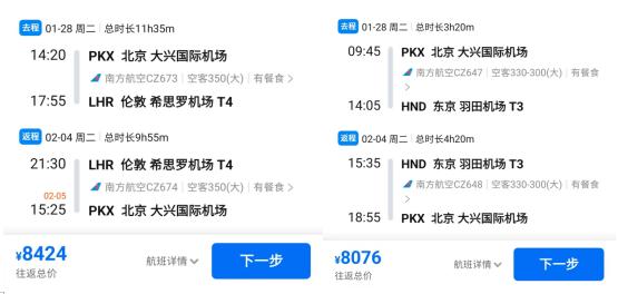 1月28-2月4日,南航北京—东京经济舱机票往返价格8076元,同期南航北京—伦敦往返8424元。