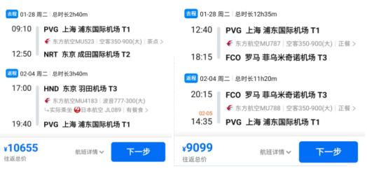 1月28-2月4日,东航上海—东京经济舱经济舱机票往返价格最高10655元,同期上海—罗马机票往返9099元。
