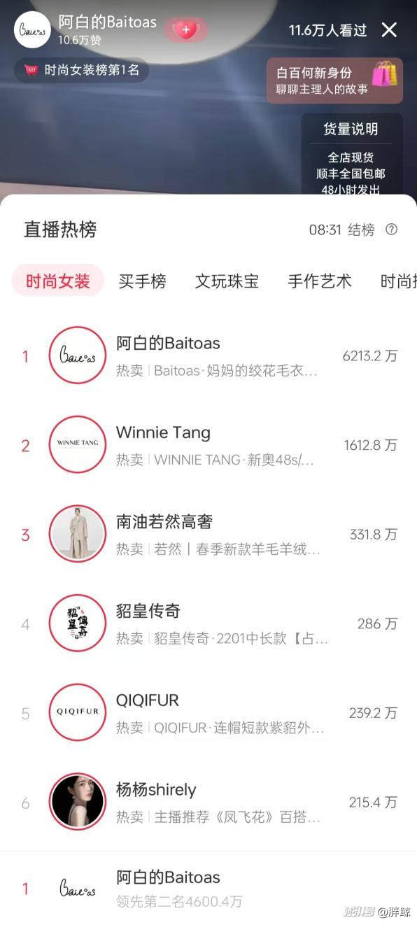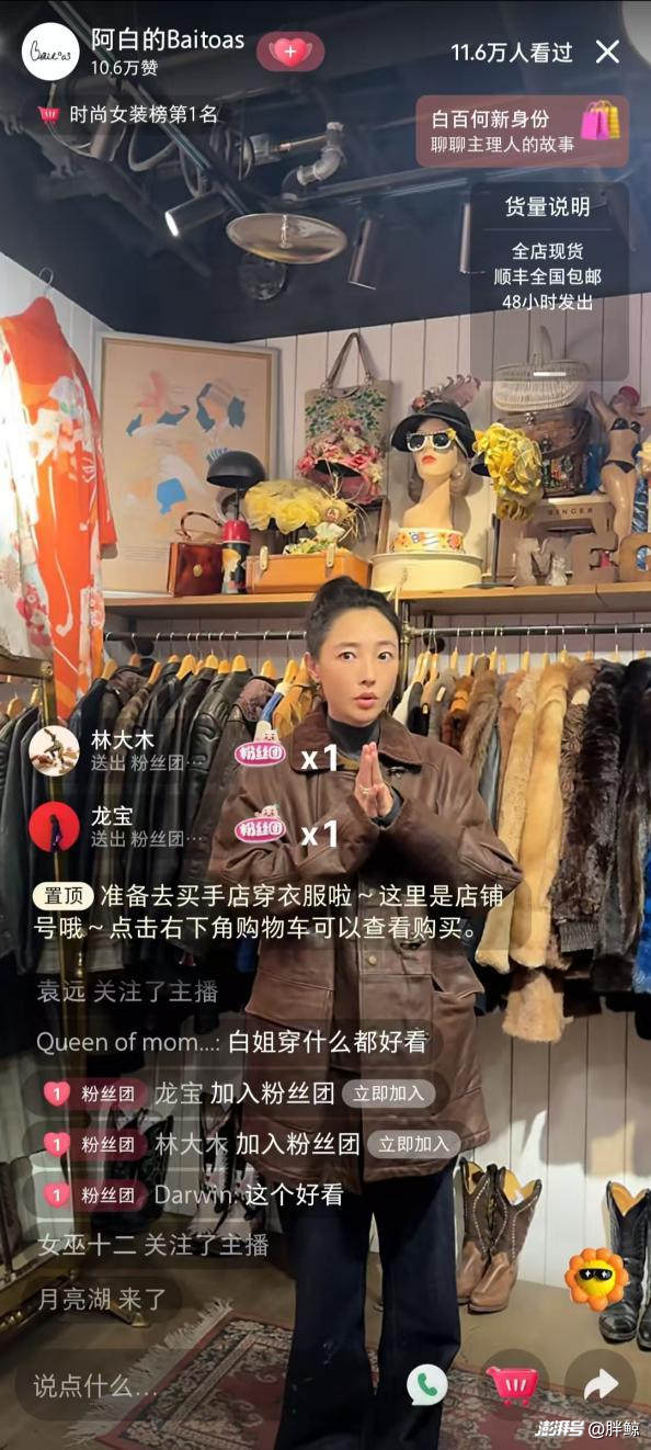 1 月 18 日晚,在复古 Vintage 古着店的背景下,白百何出现在其自创品牌@阿白的Baitoas 的小红书直播间中。几乎是 19 点一开播,大批期待已久的粉丝就涌入,不到两小时就有超过 10 万人次的流量,直播间火速冲上热榜。