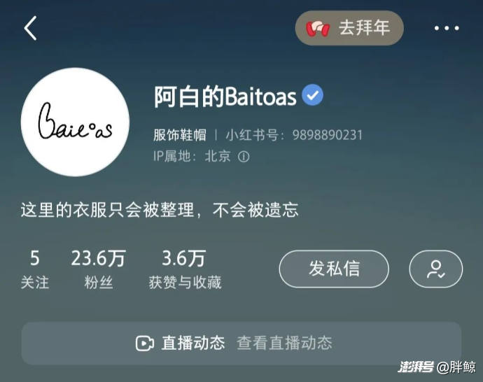 因此,一周前,白百何在小红书账号上对自己的直播首秀进行预热,并透露其筹备一年的自创品牌 Baitoas 同步上线的消息时,自然拉高了不少“穿搭粉”的期待值。直播预热阶段,其品牌账号@阿白的Baitoas 陆陆续续对外发布了六条白百何本人出镜带货的视频,在不到 10 天时间内,该账号就积累了超 20 万粉丝,相关话题也拥有超千万次的浏览量。