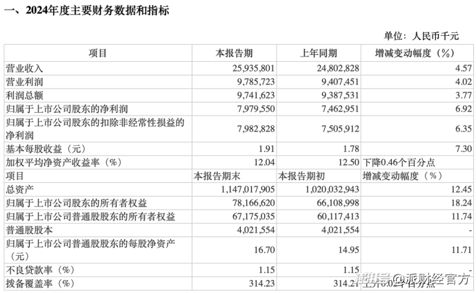 在资产质量方面,2024年末,该行的不良贷款率为1.15%,较年初持平;拨备覆盖率为314.2%,较年初上升0.02个百分点。