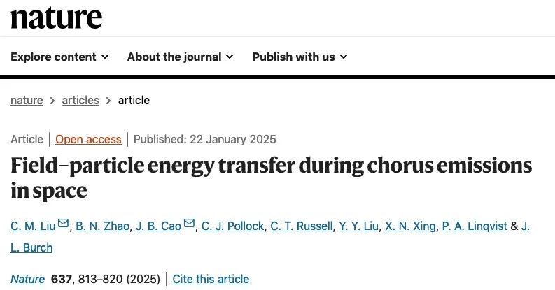 2025年1月23日,《Nature》期刊在线报道了北京航空航天大学空间与地球科学学院曹晋滨院士团队刘成明等人与来自美国和瑞典的科研人员,在地球空间合声(chorus)触发机制领域取得的最新进展:《Field-particle energy transfer during chorus emissions in space》。该工作打破了学术界关于合声波只能在地球偶极磁场控制的近地区域出现这一持续70多年的传统观点,首次发现在距离地球16万公里的非偶极磁场中性片区域也会出现合声波,其产生机制也与传统的合声波产生机制不同,来自于非线性波粒相互作用。
