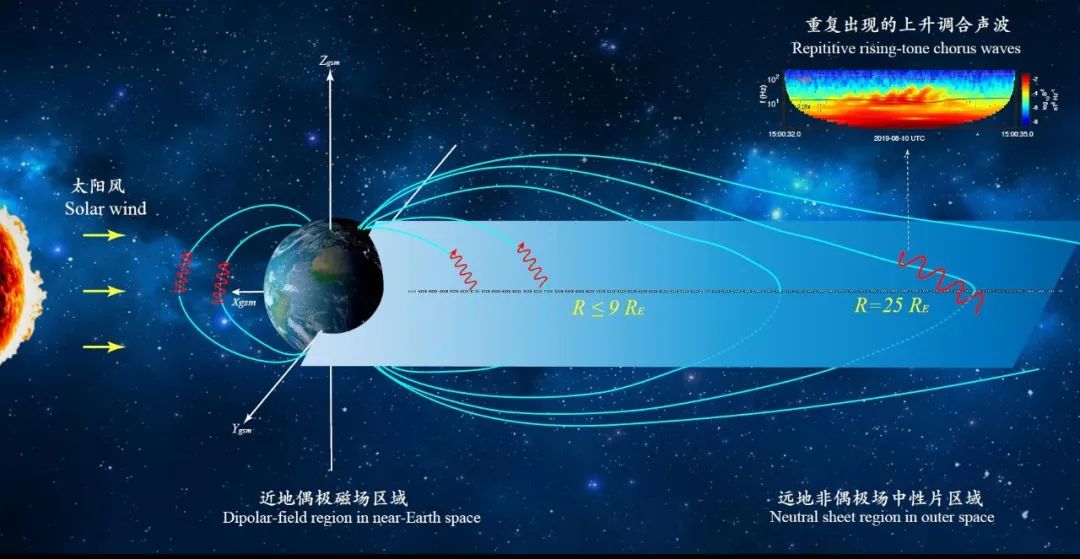 图1. 合声波在地球磁层空间中的空间分布由于上述重要性,合声波从上世纪50年代以来,一直是空间物理学研究的前沿热点。通过近70年的卫星观测和理论研究,人们对合声波已经有了较为全面的认识,发现合声波主要发生在地球近地空间偶极磁场区域(图1),地球空间地磁场磁力线就像两端固定在地球南北磁极区的琴弦一样,当太阳风能量进人地球磁层空间,并通过相关物理过程拨动这些琴弦时,就会激发频率特征类似于清晨鸟儿的齐鸣合奏的电磁波,因此称为合声。合声的频率谱呈准相干的离散点,且频率具有啁啾(chirp)特性,由于相关空间等离子体物理过程的复杂性,直至今日,对合声波的产生和传播机制依旧充满争议,未有共识。