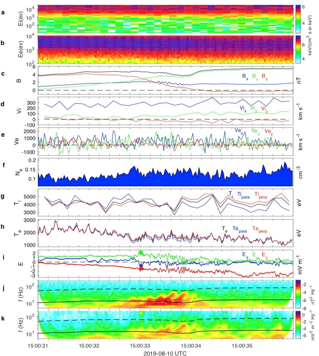 图2. MMS卫星对地球空间磁尾中性片中的合声波观测空间与地球科学学院曹晋滨教授领导的空间科学团队长期从事地球空间等离子体电磁波动和波粒相互作用研究,具有扎实的理论基础和丰富的卫星观测数据经验,取得了多项具有国际影响力重要成果。团队成员刘成明副教授等人在对合声波非线性理论进行深入研究后,认为合声波的产生是一个基本空间等离子体物理过程,不仅在传统观点认为的近地空间偶极磁场区域存在,在非偶极磁场区域,也应该存在。在对国际地球磁层多尺度卫星MMS(Magnetospheric Multiscale Mission)海量数据分析后,首次在非偶极场结构的磁尾中性片区域发现了连续出现的合声波(图2),证明了新观点。磁尾中性片区域磁场极为微弱,仅为地球表面磁场的万分之一的量级,其拓扑结构也与偶极场完全不同,在传统合声波理论框架下,那里不应该存在合声波。这一新发现打破了学术界关于合声波只能在地球偶极磁场控制的近地区域出现这一持续70多年的传统观点。