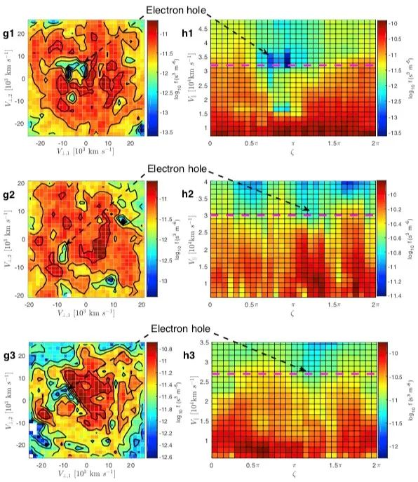 图3. 波动相空间内的电子洞刘成明副教授等人通过理论计算,发现该合声波是局地不稳定性激发,波动从热电子处获取能量,而线性波动理论给出的波动增长频率范围明显低于实际观测到的波动频率,说明非线性波动-粒子相互作用是合声波的发生原因。进一步分析二阶非线性波动-粒子共振方程,得出控制非线性波粒相互作用的非均匀因子的确切值,其满足合声波的激发条件,波动相空间会出现非对称电子洞和共振电流。在对MMS卫星电子三维速度分布数据深入分析后,刘成明副教授等人在波动相空间首次发现了理论预测的非对称电子洞(图3)和共振电流(图4),从而为合声波形成的非线性机制提供了迄今最直接的观测和理论证据。