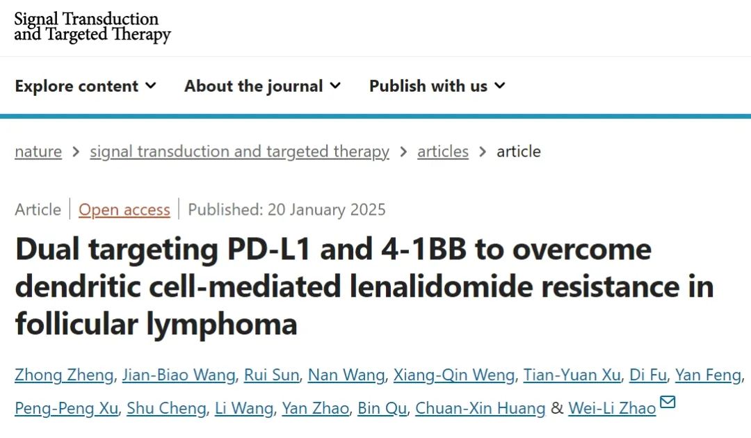 【导读】免疫调节剂来那度胺能有效治疗滤泡性淋巴瘤(FL)。团队在中国首次开展了免疫疗法利妥昔单抗联合来那度胺治疗新诊断FL的试验。2025年1月20日,上海交通大学医学院附属瑞金医院Zhao Wei-Li教授团队在期刊《Signal Transduction and Targeted Therapy volume》上发表了题为“Dual targeting PD-L1 and 4-1BB to overcome dendritic cell-mediated lenalidomide resistance in follicular lymphoma”的研究论文。团队发现,患者较差的无进展生存期与血清β2m升高和淋巴结>6厘米明显相关,这与淋巴瘤细胞自噬能力下降和肿瘤微环境中树突状细胞浸润有关。PU.1通过PD-1/PD-L1-和4-1BB/4-1BBL介导的微环境调节作用,对FL的免疫调节作用至关重要。在FL治疗的无化疗时代,PD-L1和4-1BB双靶向可能是一种替代性免疫治疗策略。