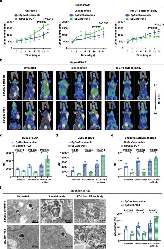SpCas9-PU.1肿瘤的大小明显大于SpCas9-scramble肿瘤。与来那度胺组相比,PD-L1和4-1BB抗体联合治疗对SpCas9-PU.1组具有抗淋巴瘤活性。使用小动物PET/CT对肿瘤进行成像。与体外研究一致,无论来那度胺治疗与否,SpCas9-PU.1组cDC1的成熟度和内细胞活性均显著降低,而PD-L1和4-1BB抗体联合治疗后,cDC1的成熟度和内细胞活性均升高。与SpCas9-scramble组相比,无论来那度胺治疗与否,SpCas9-PU.1组淋巴瘤细胞的自噬作用都会降低,而PD-L1和4-1BB抗体联合治疗则会增强。因此,PU.1改变的B淋巴瘤细胞会产生来那度胺耐药性,而PD-L1和4-1BB抗体联合治疗可以通过调节PD-1/PD-L1和4-1BB/4-1BBL介导的淋巴瘤细胞与DC的相互作用来克服这种耐药性。