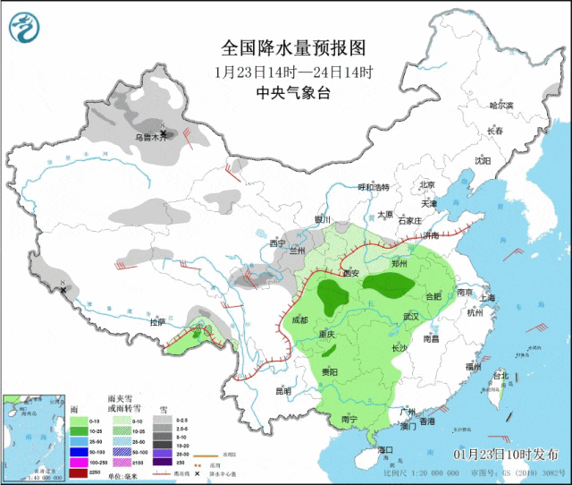 △ 1月23日14时—28日08时全国降水量预报。(来源:中央气象台)鉴于此次寒潮的强烈影响,中国气象局于23日8时30分启动了气象灾害(寒潮、暴雪)三级应急响应。