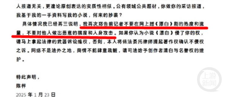 上游新闻记者注意到,1月23日上午,陈枰再次在微博发文,介绍了自己小说《漂白》和同名电视剧的创作过程。“公有领域公共题材,你做你的采访报道,我基于我的一手资料写我的小说,何来的抄袭?”“我再次郑(陈枰微博原文)告前记者不要在网上蹭《漂白》剧的热度和流量……否则,本人将依法委托律师提起著作权确认不侵权之诉。”