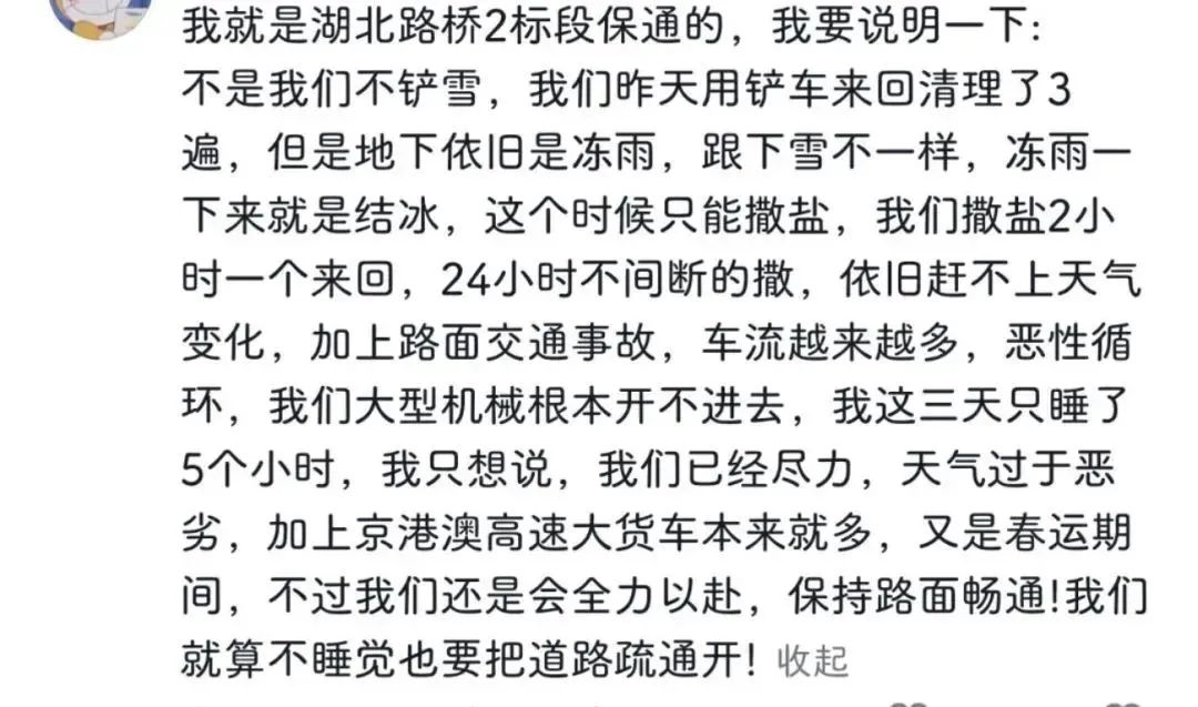 (路桥系统的网友评论 图源:长江云新闻)由此可见,冻雨带来的严重交通基础设施损害,需要持续的人工维护和运转、昼夜不间断的努力,才能够确保交通的恢复。据新华网等官方媒体报道,许多湖北本地居民自愿充当志愿者,为受困于高铁的返乡者们送去食物,有的旅客甚至主动承担起道路铲雪的工作。青年瞭望者采访到湖北的李先生,他描述道当时路面的积雪连铲车都铲不动,多亏大家自发动员志愿者们连夜人工铲冰,才使得道路得以通行。