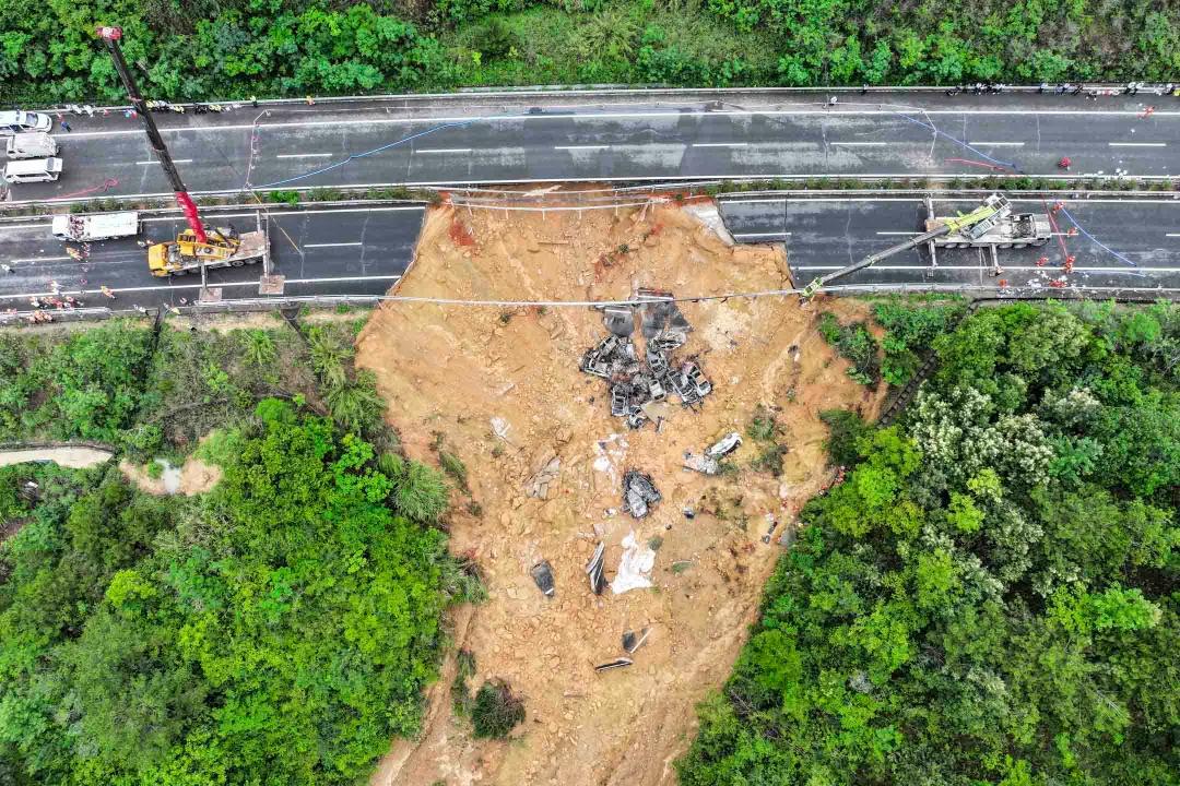 事故发生后,高速路面与山体一同滑落,形成一个巨大的土坑。公路像是被强力豁开了一道口子,数十辆燃烧后的汽车堆叠在一起,只剩下黑色的框架,零碎的车窗、座椅散落在周围,几小时前,这里曾火光冲天。“桥断了,好多车掉下去了,不断的爆炸声。我们离死亡就差100米。”据澎湃新闻报道,这是塌方亲历者胡军涛5月1日凌晨2点27分发布在微信朋友圈的文字。