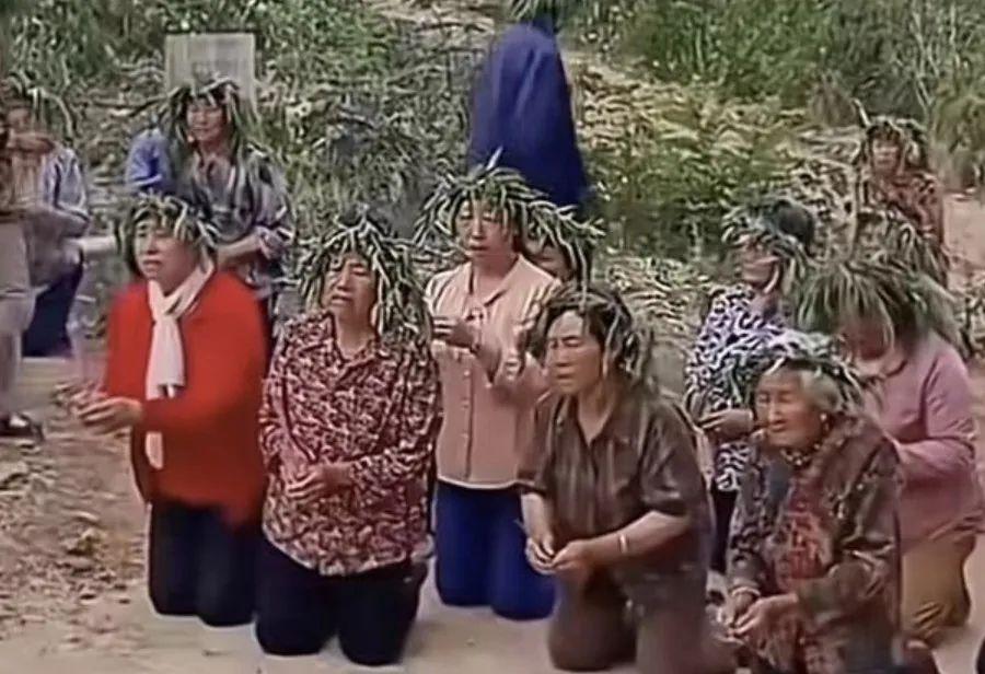 (山东省沂蒙山地区,部分农民们跪地祈雨图源:社交媒体视频截图)