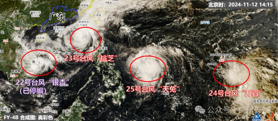 (西北太平洋出现了罕见的“四台共舞”现象图源:公众号“广州天气”)