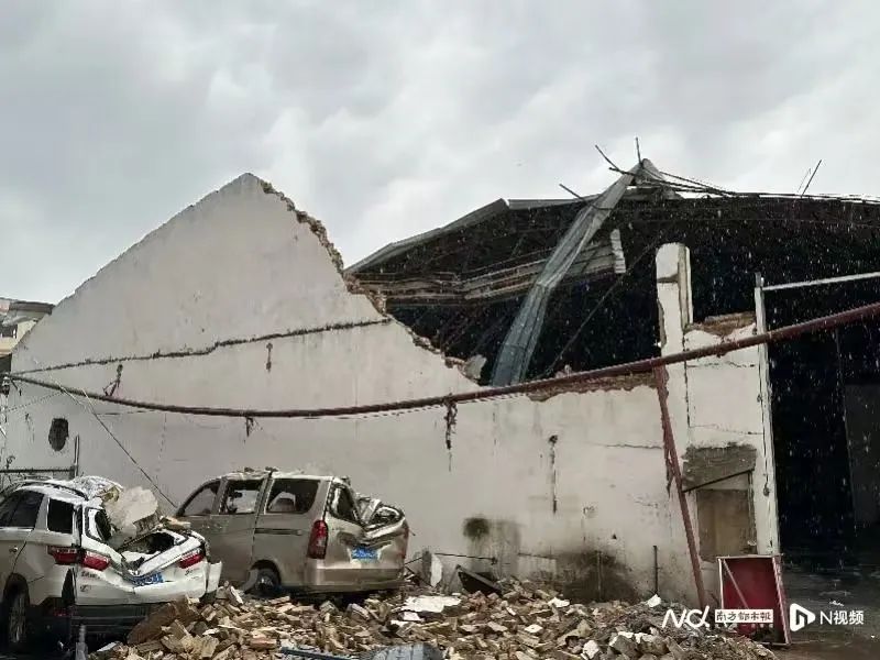 (光明村无纺布厂房墙体倒塌,砸中两辆小车图源:南方都市报)