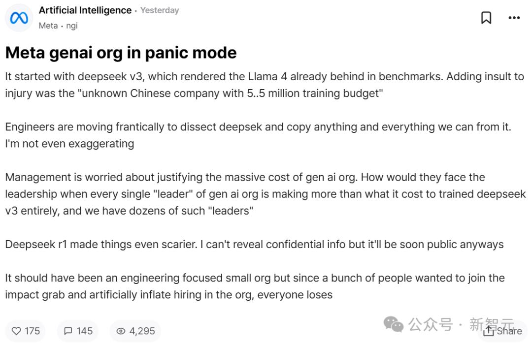 【新智元导读】Meta员工在TeamBlind爆料,点燃了一把火。自诩开源先锋的Meta,直接被DeepSeek这家中国公司整得无地自容。不仅工程师争分夺秒复现模型,年薪超过DeepSeek训练成本的高管们,心底也有点虚。