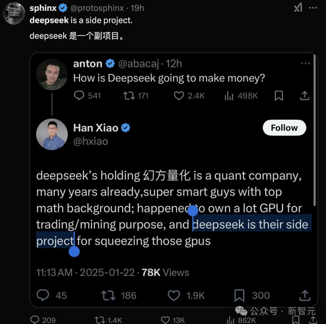 更有人曝料,DeepSeek还只是个「副项目」,主业根本不是搞大模型!