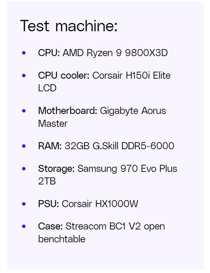 在 4K 和 1440p 测试中,测试平台搭配了 AMD 最新的 Ryzen 9 9800X3D 处理器和华硕 32 英寸 4K OLED PG32UCDP 显示器。这款显示器是 RTX 5090 的完美搭档:240Hz 刷新率足以应对该显卡在 1440p 下能达到的帧率,游戏在开启 HDR 的 OLED 面板上看起来极其出色。