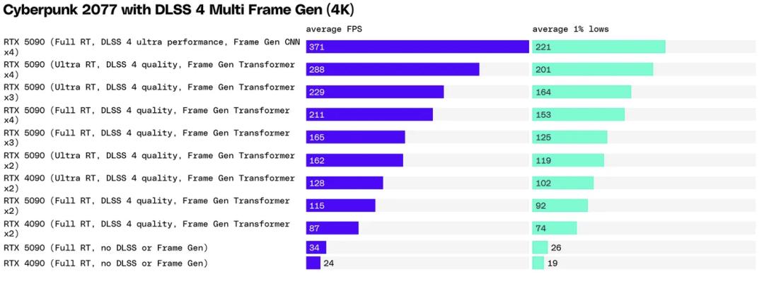 你也可以选择从 2 倍多帧生成(DLSS 3 帧生成)一直到 4 倍多帧生成。在完全路径追踪的《赛博朋克 2077》中,测试者将 34fps 提升到了使用 DLSS 超高性能、4 倍多帧生成和 CNN 模型后的 371fps。如果选择 Transformer 模型,你可以避免 CNN 的图像重影问题,在 DLSS 质量模式和 4 倍多帧生成下仍能获得 211fps,无需降低到提供较低图像质量的 DLSS 性能模式。这是基础 34fps 的六倍以上。