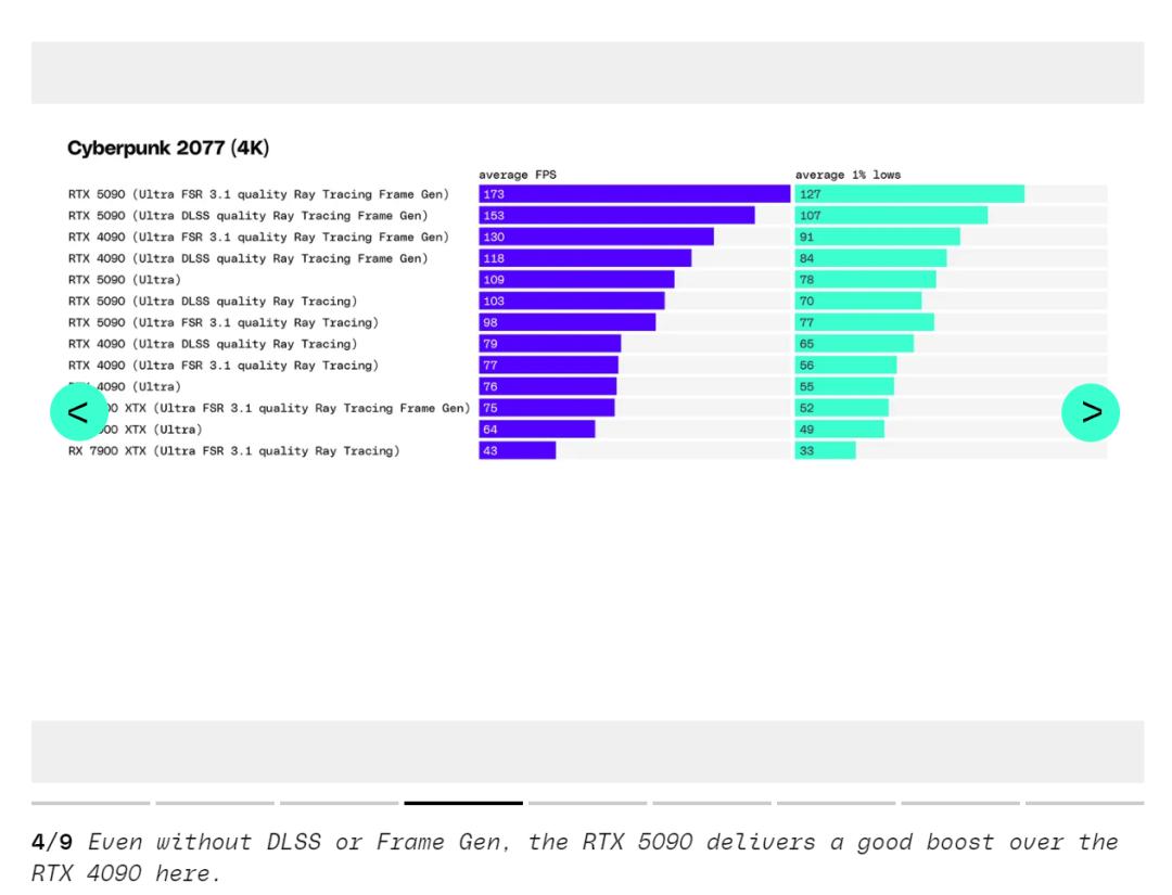 在 4K 下的《赛博朋克 2077》中,测试者看到了最大的性能提升,在没有 DLSS 或光线追踪的情况下,RTX 5090 的帧率比 RTX 4090 高 43%。如果将 RTX 5090 与售价 999 美元的 AMD Radeon RX 7900 XTX 相比,性能差距达到惊人的 70%,但价格是两倍。