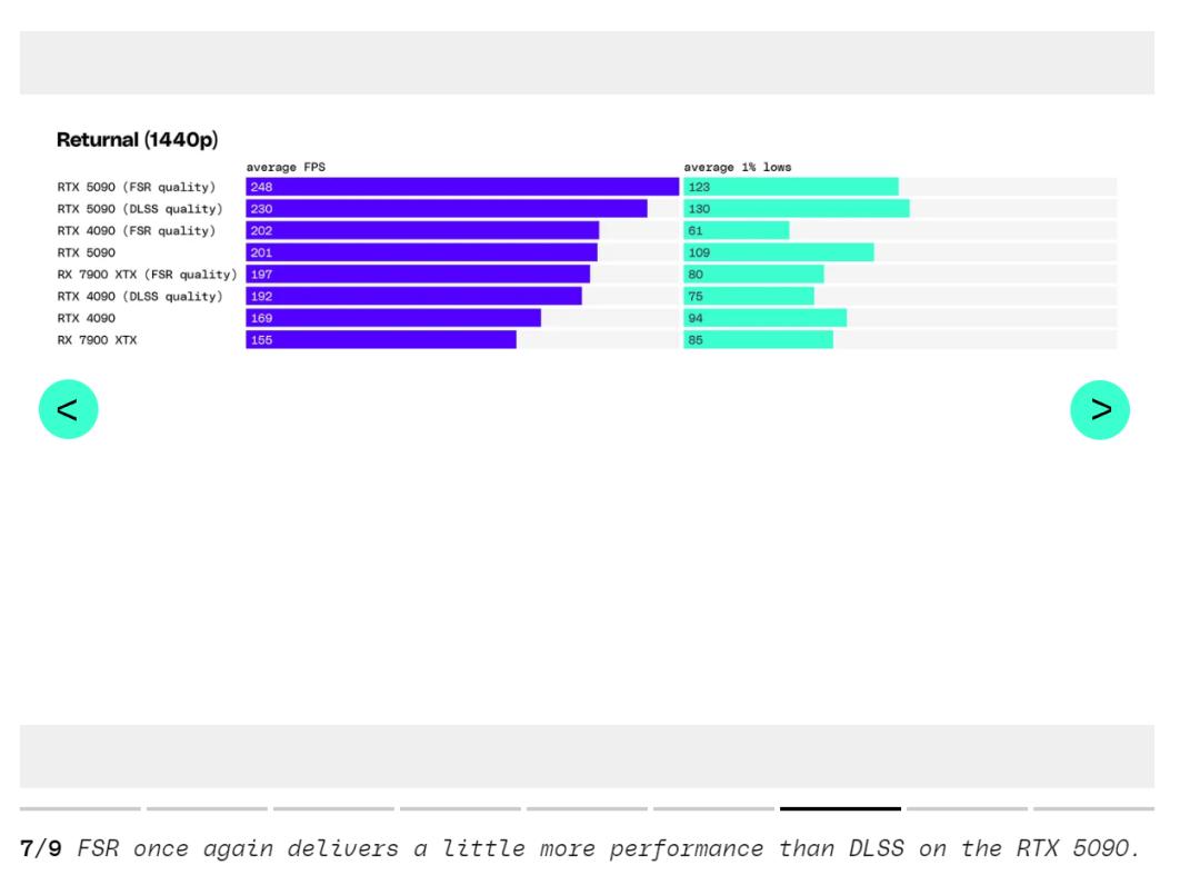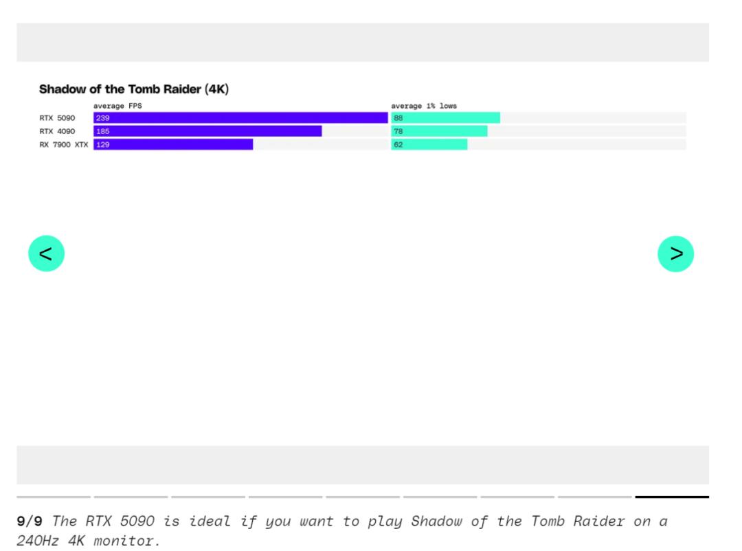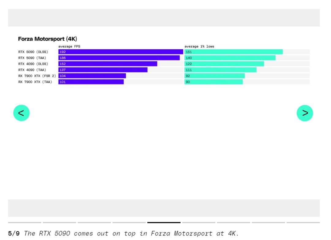 《极限竞速》使用时间反锯齿(TAA)时在 RTX 5090 上的运行速度比 RTX 4090 快 35%,测试者甚至在 4K 下的《古墓丽影:暗影》中平均达到了 238fps。