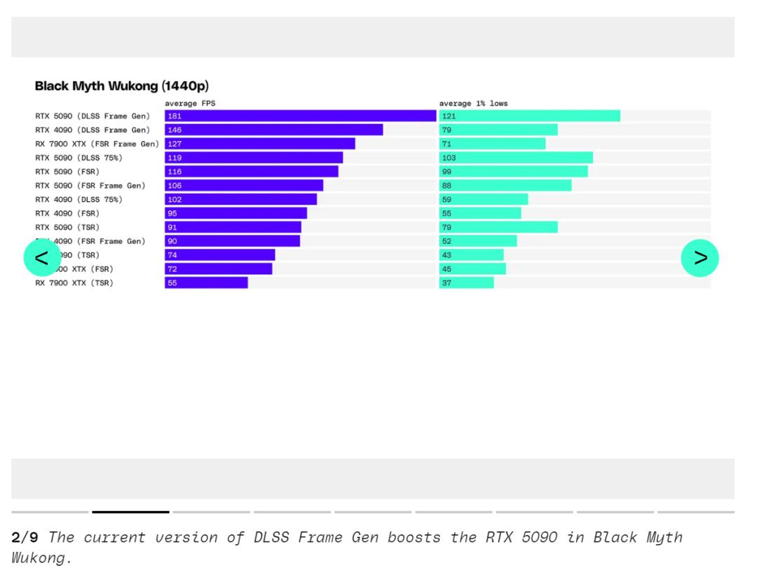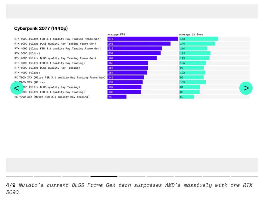 DLSS 4 的多帧生成功能显然也会在 1440p 下有所帮助,但在 The Verge 的测试游戏套件中,只有《赛博朋克 2077》在发布前支持它,所以他们的多帧生成测试集中在 4K 上。以 1,999 美元的价格,测试者认为不会有太多人仅为了 1440p 就购买 RTX 5090,但如果你在考虑这个分辨率,那么不妨看看即将发布的 RTX 5080 在这个分辨率下的表现。