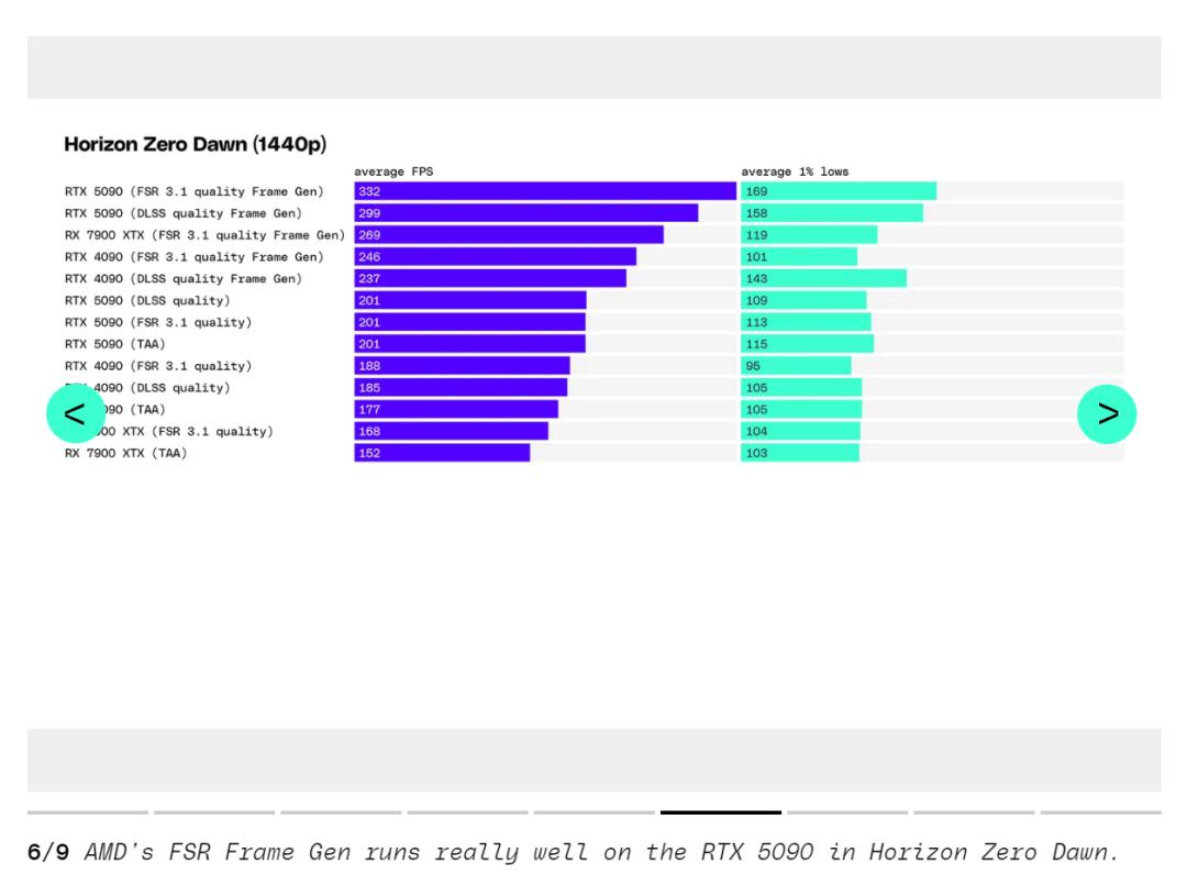《地平线:零之曙光》在 RTX 5090 上使用超高设置和仅 TAA 时平均达到 200fps。这仅比 RTX 4090 在相同设置下高出 13%。