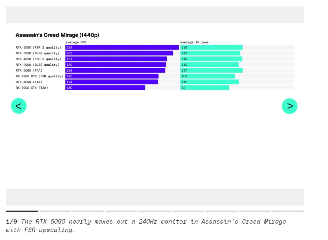 最令人失望的是《刺客信条:幻影》,RTX 5090 仅比 RTX 4090 提升了 8% 的性能。