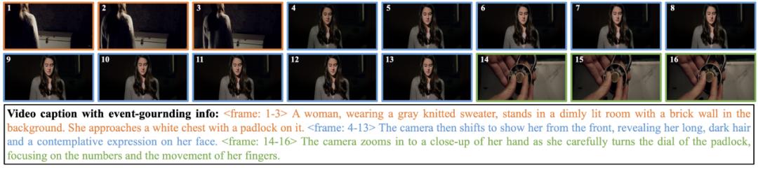 SFT:这一阶段,模型在人工标注的视频描述数据上进行训练。这个阶段的描述数据也是大有讲究。Tarsier2 提出在视频描述中引入针对每个子事件的具体定位信息(即明确每个事件源自哪些帧),以强化模型对时序信息与视觉特征的关注度,增强文本与视觉信号的对齐。