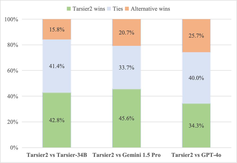 Tarsier2 在包括视频描述、短 / 长视频问答在内的通用视频理解任务上表现亮眼。在视频描述评测集 DREAM-1K 上,Tarsier2 相比 GPT-4o 提升 +2.8%,相比 Gemini-1.5-Pro 提升 +5.8%;在人工评估中,Tarsier2-7b 相比 GPT-4o 优势占比 +7.8%,相比 Gemini-1.5-Pro 优势占比 +12.3%。