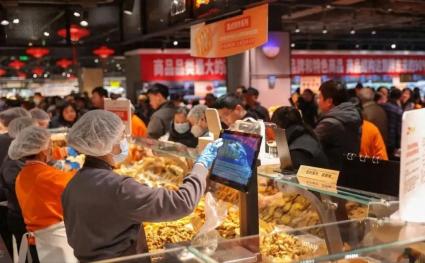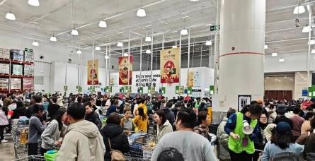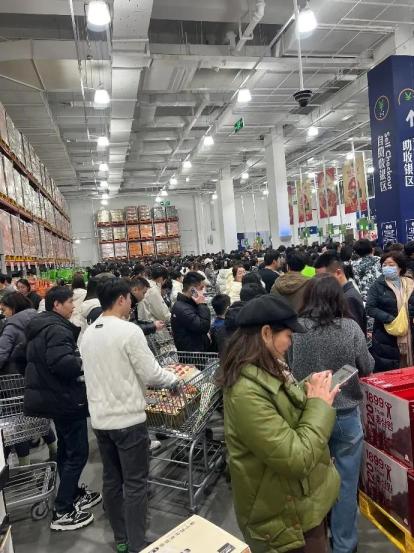 “试吃小摊上更是排队,连瓶装奶茶倒出来就那么10-20ml一小盏,居然也要排队才能尝到。收银处也是挤满了人,很多人一整车的往外搬,结账结很久。”