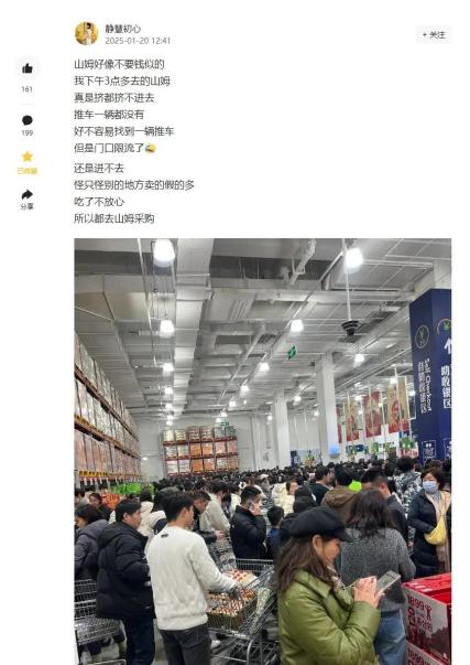 不仅是武汉,有其他地区的网友表示,下午3点去了一趟山姆发现,山姆好像不要钱似的,挤都挤不进去,推车都要抢,好不容易找到一辆推车,但门口限流还是进不去。
