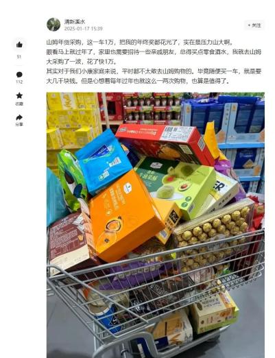 有网友晒出山姆年货采购,表示:“眼看马上就过年了,家里需要招待一些亲戚朋友,总得买点零食酒水,我就去山姆大采购了一波,一车1万,把我的年终奖都花光了,实在是压力山大啊。”