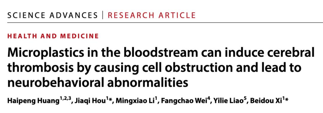 该研究以:Microplastics in the bloodstream can induce cerebral thrombosis by causing cell obstruction and lead to neurobehavioral abnormalities 为题,于 2025 年 1 月 22 日在线发表于 Science 子刊 Science Advances 上,中国环境科学研究院席北斗、侯佳奇 为论文共同通讯作者,北京大学未来技术学院博士后黄海鹏为论文第一作者。该研究追踪了微塑料颗粒在血管中的高速运动,揭示了微塑料诱导大脑功能障碍和神经损伤的机制。