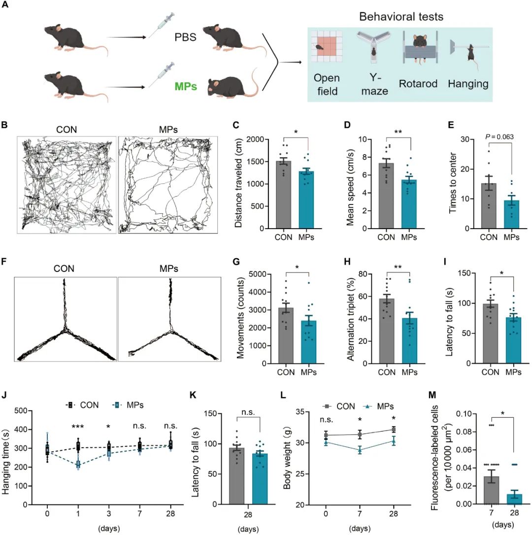 血管栓塞导致脑组织供血不足,从而导致小鼠神经活动紊乱和认知障碍。接下来,研究团队进一步探索了吞噬了微塑料的细胞在大脑血管中引起的阻塞是否会引起小鼠的行为改变。结果显示,微塑料处理(静脉注射微塑料)的小鼠的总运动距离和运动速度均明显低于对照组。在用于评估工作记忆的 Y 型迷宫测试中,微塑料处理的小鼠所行进的总距离仍低于对照组,其空间记忆显著下降。这些结果表明,微塑料可能抑制小鼠的运动能力。进一步实验显示,微塑料处理的小鼠的运动协调能力以及耐力下降。此外,该研究还发现,微塑料可诱导小鼠体重减轻,这可能是由于运动能力改变导致的摄食行为改变。在微塑料处理 28 天后,微塑料导致的大脑血管中的阻塞得到了显著恢复,这与 28天 后的小鼠的行为学实验结果相一致。