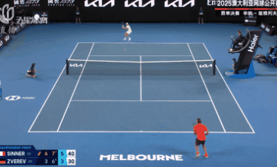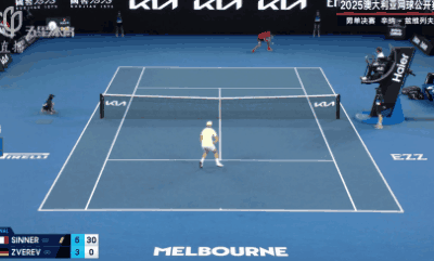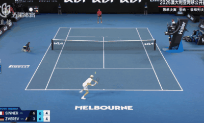 第6局比赛,兹维列夫的发球局,他的技术动作更加变形,很快就以15-40落后,辛纳没有错过机会,在第二个破发点完成破发,取得先机。第7局,兹维列夫努力追分,15-40的情况下几次将比分追平,但都被辛纳一一化解,5-2,辛纳离卫冕冠军只剩一局。